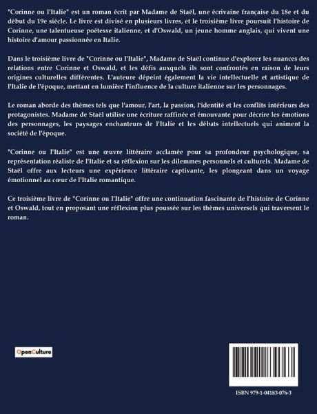 "Corinne ou l'Italie" est un roman de Germaine de Staël qui explore les paysages culturels et émotionnels de l'Italie à travers les yeux de ses personnages principaux, Corinne et Oswald. Le récit est divisé en vingt livres, chacun abordant différents aspects de l'Italie, de ses monuments à ses coutumes, en passant par sa littérature et son art. Le roman commence par l'arrivée d'Oswald, un noble anglais, en Italie, où il rencontre Corinne, une femme d'une grande intelligence et d'un talent artistique exceptionnel. Leur relation se développe sur fond de découvertes culturelles et de réflexions sur la société italienne. Corinne, couronnée au Capitole pour son génie littéraire, incarne la fusion de la sensibilité artistique et de la profondeur intellectuelle. À travers leurs voyages, les personnages explorent des lieux marquants tels que Rome, Naples et Venise, tout en s'interrogeant sur les différences culturelles entre l'Italie et l'Angleterre. Le roman aborde également des thèmes universels tels que l'amour, la liberté, et le conflit entre les aspirations personnelles et les attentes sociales. Finalement, "Corinne ou l'Italie" est une méditation sur l'identité, la culture et la quête de sens dans un monde en transformation.