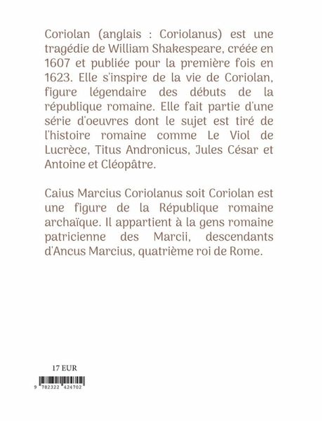 Coriolan (anglais : Coriolanus) est une tragédie de William Shakespeare, créée en 1607 et publiée pour la première fois en 1623. Elle s'inspire de la vie de Coriolan, figure légendaire des débuts de la république romaine. Elle fait partie d'une série d'oeuvres dont le sujet est tiré de l'histoire romaine comme Le Viol de Lucrèce, Titus Andronicus, Jules César et Antoine et Cléopâtre.Caius Marcius Coriolanus soit Coriolan est une figure de la République romaine archaïque. Il appartient à la gens romaine patricienne des Marcii, descendants d'Ancus Marcius, quatrième roi de Rome.