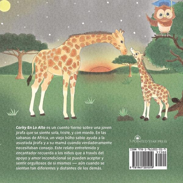 Corky En Lo Alto es un cuento tierno sobre una joven jirafa que se siente sola, triste, y con miedo. En las sabanas de Africa, un viejo búho sabio ayuda a la asustada jirafa y a su mamá cuando verdaderamente necesitaban consejo. Este relato entretenido y encantador recuerda a los niños que a través del apoyo y amor incondicional se pueden aceptar y sentir orgullosos de si mismos - aún cuando se sientan tan diferentes y distantes de los demás. Also available in English: Corky's Tall Tale is a heart-felt story about a young giraffe who feels lonely, sad and afraid. In the savannas of Africa, a wise old owl lends a helping hand to the scared little giraffe and his mother when they are in dire need of guidance. This engaging and enchanting tale reminds children that through unconditional love and support they can accept and even be proud of who they are-even when they feel so different and isolated from those around them.