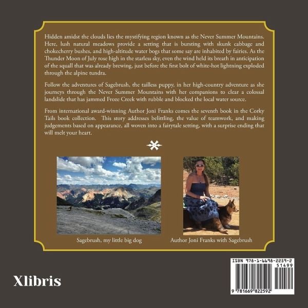 Hidden amidst the clouds lies the mystifying region known as the Never Summer Mountains. Here, lush natural meadows provide a setting that is bursting with skunk cabbage and chokecherry bushes, and high-altitude water bogs that some say are inhabited by fairies. As the Thunder Moon of July rose high in the starless sky, even the wind held its breath in anticipation of the squall that was already brewing, just before the first bolt of white-hot lightning exploded through the alpine tundra. Follow the adventures of Sagebrush, the tailless puppy, in her high-country adventure as she journeys through the Never Summer Mountains with her companions to clear a colossal landslide that has jammed Froze Creek with rubble and blocked the local water source. From international award-winning Author Joni Franks comes the seventh book in the Corky Tails book collection. This story addresses belittling, the value of teamwork, and making judgements based on appearance, all woven into a fairytale setting, with a surprise ending that will melt your heart.