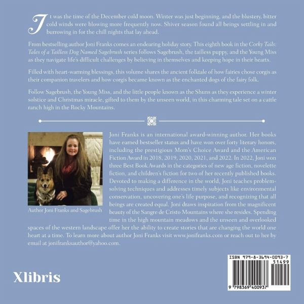 It was the time of the December cold moon. Winter was just beginning, and the blustery, bitter cold winds were blowing more frequently now. Shiver season found all beings settling in and burrowing in for the chill nights that lay ahead. From bestselling author Joni Franks comes an endearing holiday story. This eighth book in the Corky Tails: Tales of a Tailless Dog Named Sagebrush series follows Sagebrush, the tailless puppy, and the Young Miss as they navigate life's difficult challenges by believing in themselves and keeping hope in their hearts. Filled with heart-warming blessings, this volume shares the ancient folktale of how fairies chose corgis as their companion travelers and how corgis became known as the enchanted dogs of the fairy folk. Follow Sagebrush, the Young Miss, and the little people known as the Shuns as they experience a winter solstice and Christmas miracle, gifted to them by the unseen world, in this charming tale set on a cattle ranch high in the Rocky Mountains.