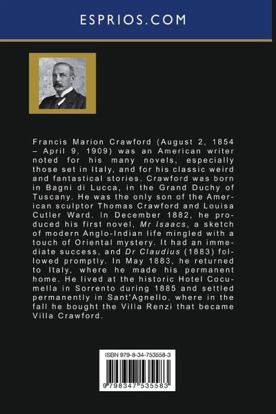 Francis Marion Crawford (August 2, 1854 - April 9, 1909) was an American writer noted for his many novels, especially those set in Italy, and for his classic weird and fantastical stories. Crawford was born in Bagni di Lucca, in the Grand Duchy of Tuscany. He was the only son of the American sculptor Thomas Crawford and Louisa Cutler Ward. In December 1882, he produced his first novel, Mr Isaacs, a sketch of modern Anglo-Indian life mingled with a touch of Oriental mystery. It had an immediate success, and Dr Claudius (1883) followed promptly. In May 1883, he returned to Italy, where he made his permanent home. He lived at the historic Hotel Cocumella in Sorrento during 1885 and settled permanently in Sant'Agnello, where in the fall he bought the Villa Renzi that became Villa Crawford.