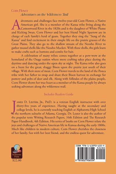 Adventures and challenges face twelve-year-old Corn Flower, a Native American girl. She is a member of the Kansa tribe living along the Cottonwood River in the 1820s and is the daughter of White Plume and Kicking Swan. Corn Flower and her best friend Night Sparrow are in charge of each family's herd of goats. Together they sing the "Song of the Kansa" and find excitement in their simple life on the prairie grasses of the Great Plains. They also go to the shallow stream of the Neosho River to gather mussel shells like the Neosho Mucket. With these shells, the girls learn to make crafts such as buttons and combs for hair. A celebration of many tribes comes together at a pow-wow at the homeland of the Osage nation where more crafting takes place during the daytime and dancing under the open sky at night. The Kansa tribe also goes on a hunt for the great, shaggy Bison upon the prairie just south of their village. With their store of meat, Corn Flower travels to the land of the Ponca tribe with her father to swap and share their Bison harvest in exchange for pottery and pelts of deer and elk. Along with folktales of the plains people, Corn Flower shows her true heart as a member of the Kansa people by always seeking adventure along the wilderness trail. Includes Readers Guide.