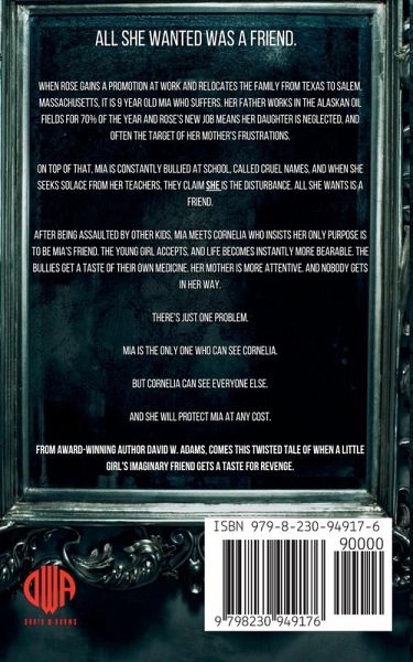 You can't see her... but she can see you. When Rose gains a promotion at work and relocates the family from Texas to Salem, Massachusetts, it is 9 year old Mia who suffers. Her father works in the Alaskan oil fields for seventy percent of the year and Rose's new job means her daughter is neglected, and often the target of her mother's frustrations. On top of that, Mia is constantly bullied at school, called cruel names, and when she seeks solace from her teachers, they claim she is the disturbance. All she wants is a friend. After being assaulted by other kids, Mia runs to hide in the bathroom, where she meets Cornelia. The girl is clearly older, around fifteen, but insists her only purpose is to be Mia's friend. The young girl accepts, and life becomes instantly more bearable. The bullies get a taste of their own medicine. Her mother is more attentive. And nobody gets in her way. There's just one problem. Mia is the only one who can see Cornelia. But Cornelia can see everyone else. And she will protect Mia at any cost. From award-winning author David W. Adams, comes this twisted tale of when a little girl's imaginary friend gets a taste for revenge.