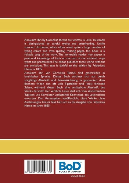 Annalium libri von Cornelius Tacitus sind geschrieben in lateinischer Sprache. Dieses Buch zeichnet sich aus durch sorgfältige Abschrift und Korrekturlesung. In gescannten alten Büchern finden sich oft viele Tippfehler und (teils) fehlende Seiten, während dieses Buch eine verlässliche Abschrift des Werks darstellt. Der verehrte Leser darf sich vom akademischen Typisten und Korrektor umfassende Kenntnisse des Lateinischen erwarten. Der Herausgeber veröffentlicht dieseWerke ohne Auslassungen. Dieser Text hält sich an die Ausgabe von Fridericus Haase im Jahr 1855.