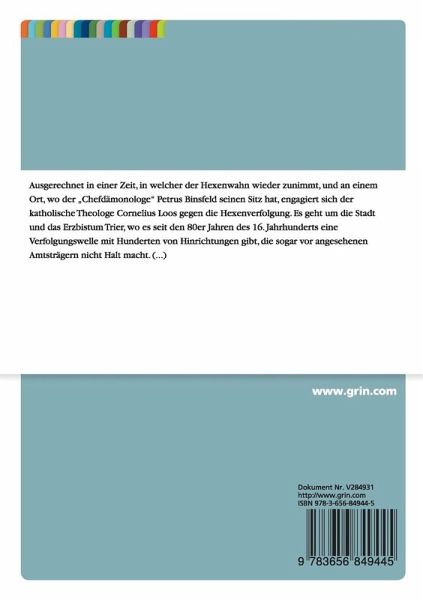 Examensarbeit aus dem Jahr 2012 im Fachbereich Theologie - Historische Theologie, Kirchengeschichte, Note: 2,0, Ruprecht-Karls-Universität Heidelberg (Historisches Seminar), Veranstaltung: Wissenschaftliche Staatsprüfung für das Lehramt an Gymnasien, Sprache: Deutsch, Abstract: Ausgerechnet in einer Zeit, in welcher der Hexenwahn wieder zunimmt, und an einem Ort, wo der "Chefdämonologe" Petrus Binsfeld seinen Sitz hat, engagiert sich der katholische Theologe Cornelius Loos gegen die Hexenverfolgung. Es geht um die Stadt und das Erzbistum Trier, wo es seit den 80er Jahren des 16. Jahrhunderts eine Verfolgungswelle mit Hunderten von Hinrichtungen gibt, die sogar vor angesehenen Amtsträgern nicht Halt macht. Der Trierer Weihbischof und Universitätslehrer Petrus Binsfeld hat in dieser Zeit eine Art Aktualisierung des "Hexenhammer" verfasst, die ein Bestseller wird. Darin redet er einer brutalen Intensivierung der Hexenverfolgung das Wort. Der renommierte holländische Theologe Loos, der ebenfalls in Trier lehrt, verfasst Briefe an wichtige Persönlichkeiten, in denen er sich gegen Hexenprozesse ausspricht und wagt mit seinem 1592 verfassten Traktat "De vera et falsa magia" einen Angriff gegen Binsfeld sowie gegen die gängige Dämonologie und Hexenangst.In dieser Arbeit möchte ich den folgenden Fragen nachgehen: Wie argumentiert Loos gegen die Hexenverfolgung und welche Argumente führt er an? Welches Schicksal erleidet er damit? Was hat er in der Hexenproblematik erreicht?