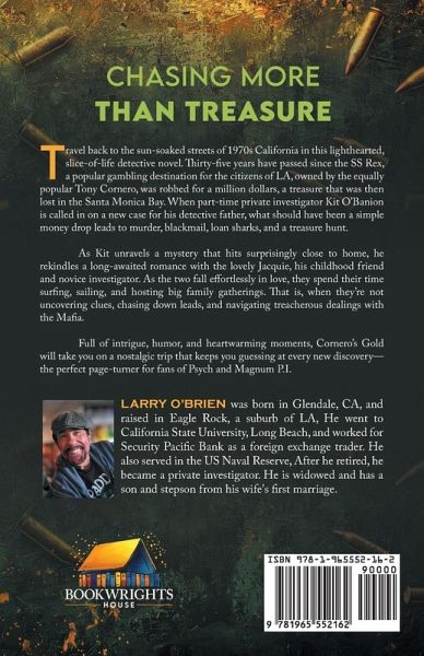 Chasing more than treasure. Travel back to the sun-soaked streets of 1970s California in this lighthearted, slice-of-life detective novel. Thirty-five years have passed since the SS Rex, a popular gambling destination for the citizens of LA, owned by the equally popular Tony Cornero, was robbed for a million dollars, a treasure that was then lost in the Santa Monica Bay. When part-time private investigator Kit O'Banion is called in on a new case for his detective father, what should have been a simple money drop leads to murder, blackmail, loan sharks, and a treasure hunt. As Kit unravels a mystery that hits surprisingly close to home, he rekindles a long-awaited romance with the lovely Jacquie, his childhood friend and novice investigator. As the two fall effortlessly in love, they spend their time surfing, sailing, and hosting big family gatherings. That is, when they're not uncovering clues, chasing down leads, and navigating treacherous dealings with the Mafia. Full of intrigue, humor, and heartwarming moments, Cornero's Gold will take you on a nostalgic trip that keeps you guessing at every new discovery- the perfect page-turner for fans of Psych and Magnum P.I.¿