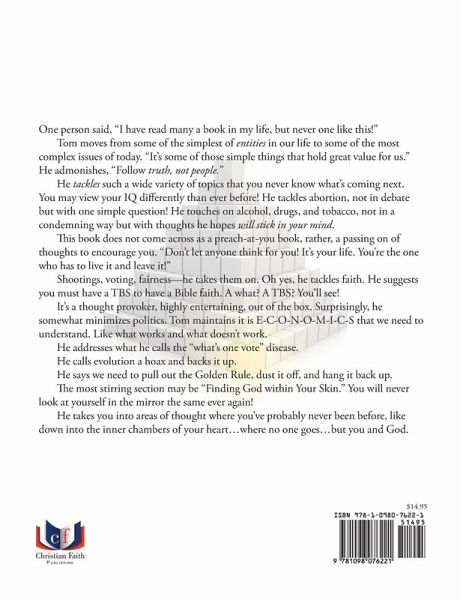 One person said, "I have read many a book in my life, but never one like this!" Tom moves from some of the simplest of entities in our life to some of the most complex issues of today. "It's some of those simple things that hold great value for us." He admonishes, "Follow truth, not people." He tackles such a wide variety of topics that you never know what's coming next. You may view your IQ differently than ever before! He tackles abortion, not in debate but with one simple question! He touches on alcohol, drugs, and tobacco, not in a condemning way but with thoughts he hopes will stick in your mind. This book does not come across as a preach-at-you book, rather, a passing on of thoughts to encourage you. "Don't let anyone think for you! It's your life. You're the one who has to live it and leave it!" Shootings, voting, fairness-he takes them on. Oh yes, he tackles faith. He suggests you must have a TBS to have a Bible faith. A what? A TBS? You'll see! It's a thought provoker, highly entertaining, out of the box. Surprisingly, he somewhat minimizes politics. Tom maintains it is E-C-O-N-O-M-I-C-S that we need to understand. Like what works and what doesn't work. He addresses what he calls the "what's one vote" disease. He calls evolution a hoax and backs it up. He says we need to pull out the Golden Rule, dust it off, and hang it back up. The most stirring section may be "Finding God within Your Skin." You will never look at yourself in the mirror the same ever again! He takes you into areas of thought where you've probably never been before, like down into the inner chambers of your heart...where no one goes...but you and God.