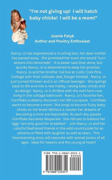 Nancy Jo has experienced a crushing loss, her dear mother has passed away. She promised her mom she would "turn lemons into lemonade". It is easier said than done, but spunky Nancy Jo is determined to keep her promise. Nancy Jo and her brother Cal live at rustic Cork Pine Cottage with their widower dad, Ranger Kimball. Nancy Jo just turned thirteen and is an official teenager. She springs back to life and into a new hobby, raising baby chicks and ducklings! Nancy Jo is thrilled with the mini farm now living in the cottage bathroom. Nancy Jo's favorite hen, Cornflake suddenly discovers her life's purpose. Cornflake wants to become a mom! She longs to bounce fuzzy baby chicks on her knee! Without a rooster her dreams of becoming a mom are impossible. As each day passes Cornflake becomes desperate. She refuses to believe her eggs "are only good for breakfast". Join Nancy Jo and her colorful feathered friends in the wild countryside for an adventure filled with laughter as well as tears. This heartwarming story will resonate with animal lovers of all ages. Ideal for tweens and the young at heart!