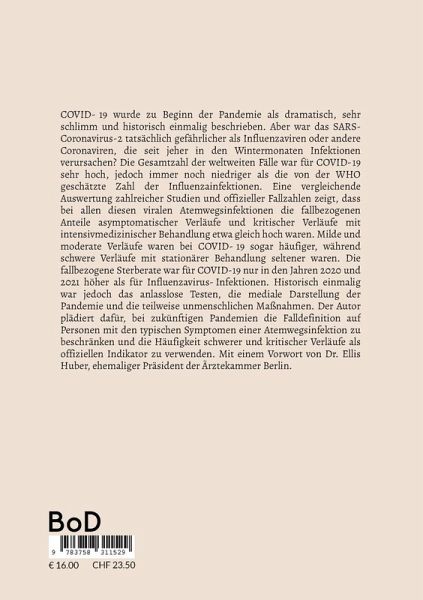 COVID-19 wurde zu Beginn der Pandemie als dramatisch, sehr schlimm und historisch einmalig beschrieben. Aber war das SARS-Coronavirus-2 tatsächlich gefährlicher als Influenzaviren oder andere Coronaviren, die seit jeher in den Wintermonaten Infektionen verursachen? Die Gesamtzahl der weltweiten Fälle war für COVID-19 sehr hoch, jedoch immer noch niedriger als die von der WHO geschätzte Zahl der Influenzainfektionen. Eine vergleichende Auswertung zahlreicher Studien und offizieller Fallzahlen zeigt, dass bei allen diesen viralen Atemwegsinfektionen die fallbezogenen Anteile asymptomatischer Verläufe und kritischer Verläufe mit intensivmedizinischer Behandlung etwa gleich hoch waren. Milde und moderate Verläufe waren bei COVID-19 sogar häufiger, während schwere Verläufe mit stationärer Behandlung seltener waren. Die fallbezogene Sterberate war für COVID-19 nur in den Jahren 2020 und 2021 höher als für Influenzavirus-Infektionen. Historisch einmalig war jedoch das anlasslose Testen,die mediale Darstellung der Pandemie und die teilweise unmenschlichen Maßnahmen. Der Autor plädiert dafür, bei zukünftigen Pandemien die Falldefinition auf Personen mit den typischen Symptomen einer Atemwegsinfektion zu beschränken und die Häufigkeit schwerer und kritischer Verläufe als offiziellen Indikator zu verwenden. Mit einem Vorwort von Dr. Ellis Huber, ehemaliger Präsident der Ärztekammer Berlin.