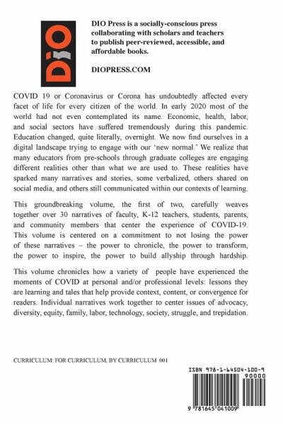COVID 19 or Coronavirus or Corona has undoubtedly affected every facet of life for every citizen of the world. In early 2020 most of the world had not even contemplated its name. Economic, health, labor, and social sectors have suffered tremendously during this pandemic. Education changed, quite literally, overnight. We now find ourselves in a digital landscape trying to engage with our 'new normal.' We realize that many educators from pre-schools through graduate colleges are engaging different realities other than what we are used to. These realities have sparked many narratives and stories, some verbalized, others shared on social media, and others still communicated within our contexts of learning. This groundbreaking volume, the first of two, carefully weaves together over 30 narratives of faculty, K-12 teachers, students, parents, and community members that center the experience of COVID-19. This volume is centered on a commitment to not losing the power of these narratives - the power to chronicle, the power to transform, the power to inspire, the power to build allyship through hardship. This volume chronicles how a variety of people have experienced the moments of COVID at personal and/or professional levels: lessons they are learning and tales that help provide context, content, or convergence for readers. Individual narratives work together to center issues of advocacy, diversity, equity, family, labor, technology, society, struggle, and trepidation.