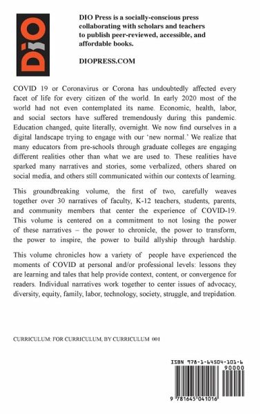 COVID 19 or Coronavirus or Corona has undoubtedly affected every facet of life for every citizen of the world. In early 2020 most of the world had not even contemplated its name. Economic, health, labor, and social sectors have suffered tremendously during this pandemic. Education changed, quite literally, overnight. We now find ourselves in a digital landscape trying to engage with our 'new normal.' We realize that many educators from pre-schools through graduate colleges are engaging different realities other than what we are used to. These realities have sparked many narratives and stories, some verbalized, others shared on social media, and others still communicated within our contexts of learning. This groundbreaking volume, the first of two, carefully weaves together over 30 narratives of faculty, K-12 teachers, students, parents, and community members that center the experience of COVID-19. This volume is centered on a commitment to not losing the power of these narratives - the power to chronicle, the power to transform, the power to inspire, the power to build allyship through hardship. This volume chronicles how a variety of people have experienced the moments of COVID at personal and/or professional levels: lessons they are learning and tales that help provide context, content, or convergence for readers. Individual narratives work together to center issues of advocacy, diversity, equity, family, labor, technology, society, struggle, and trepidation.
