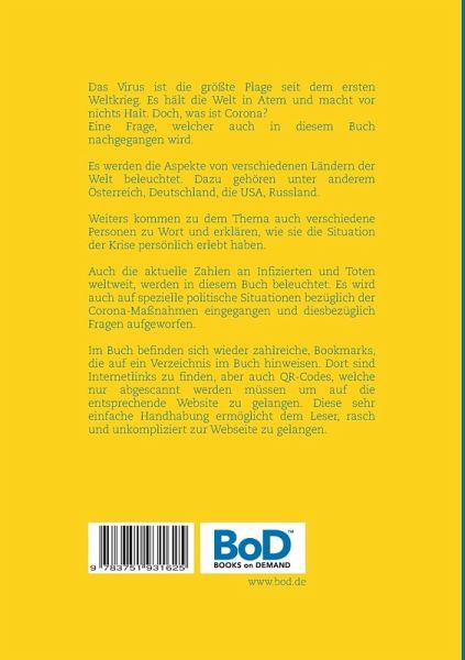 Das Virus ist die größte Plage seit dem ersten Weltkrieg. Es hält die Welt in Atem und macht vor nichts Halt. Doch, was ist Corona? Eine Frage, welcher auch in diesem Buch nachgegangen wird. Es werden die Aspekte von verschiedenen Ländern der Welt beleuchtet. Dazu gehören unter anderem Österreich, Deutschland, die USA, Russland. Weiters kommen zu dem Thema auch verschiedene Personen zu Wort und erklären, wie sie die Situation der Krise persönlich erlebt haben.Auch die aktuelle Zahlen an Infizierten und Toten weltweit, werden in diesem Buch beleuchtet. Es wird auch auf spezielle politische Situationen bezüglich der Corona-Maßnahmen eingegangen und diesbezüglich Fragen aufgeworfen.Im Buch befinden sich wieder zahlreiche, sogenannte Bookmarks, die auf ein Verzeichnis im Buch hinweisen. Dort sind Internetlinks zu finden, aber auch QR-Codes, welche nur abgescannt werden müssen um auf die entsprechende Website zu gelangen. Diese sehr einfache Handhabung ermöglicht dem Leser, rasch undunkompliziert zur Webseite zu gelangen.