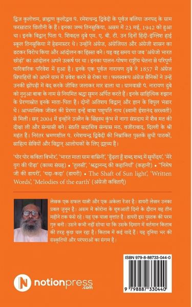 Ramesh Chanara Dwiveai was born 1942. it was the peak of India's Freedom Struggle and 'Quit India' slogan agains the Britishers was echoing all around. Born to the learned parents and during a revolutionary peak of patriotism. He was groomed in a highly conscious environment. Ramesh Chandra Dwivedi, pursued a multi-faceted career throughout his youthful years. He had the opportunity to serve the public sector organizations viz. the Indian Army and Air India. Widely travelled, he acquired rich personal experience through varied cultural interactions spread across many countries of the world. After an exhaustive exposure to the brouhaha of modernism, he decided to renounce the mundane life. He adopted 'Sanyas'. As a grown up author he is known by more than one pseudonyms e.g. Nimeshji, Ramesh Jaimini, Shradhanand etc. He laughs at the anxious desire of his admirers expecting to address the 'litterateur Swamiji' with a single identification. Throughout the literary endeavours, his inner humanist always thrives to piously advocate for the Cardinal Humane Principles. The present creation Two Kissing Leaves is a modest addition continuous urge. Earlier Presentations by the Author: 1. POR POR KAVITA VIBHOR. (Hindi Poetry) 2.BHARAT MAATA GRAM-VASINI. (Hindi Poetry) 3.DHHOONTA HUN SHABD-SHABDMHIN SURYODAY. (Hindi Poetry) 4. MERE YUG KI PEERA (Hindi Poetry) 5. TULSI (Hindi Stories) 6. DR. ANANYA (Hindi Stories) 7. NIMISHJI KI DIARY (Diary) 8. YADAKADA (Diary) 9. THE SHAFTS OF SUNLIGHT (English Poetry) 10. THE MELODIES OF MOTHER EARTH 11. WRITTEN WORDS