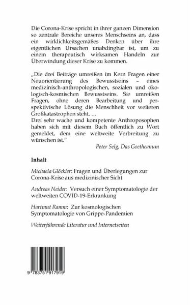 Dieses Buch möchte ein wirklichkeitsgemäßes Denken über die eigentlichen Ursachen solcher Epidemien wie der jetzigen Corona-Erkrankung anregen und ein therapeutisch wirksames Handeln zur Überwindung der Krankheit fördern. Dabei dienen die Verständnishilfen aus der anthroposophischen Geisteswissenschaft und Medizin zu den Hintergründen epidemischer Erkrankungen sowie der jedem Menschen zur Verfügung stehende gesunde Menschenverstand als Leitfaden.