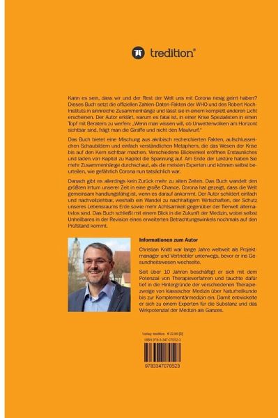 Viele wichtige Institutionen in unserer Demokratie haben in der Corona-Krise an Glaubwürdigkeit eingebüßt und damit eine Verunsicherung in der Gesellschaft hervorgerufen, die aktuell von radikalen Strömungen zu teils haarsträubenden Wahrheitsdeutungen genutzt wird. Ein Rückblick auf Corona im Jahr 2020 bietet die Möglichkeit, damals entstandene Risse in der Gesellschaft wieder zu kitten. Das Buch beschreibt die Fakten- und Gefährdungslage zu Beginn der Krise aus zahlreichen Perspektiven auf Basis von sauberen Informationsquellen. Beurteilen Sie selbst, ob die Reaktionen auf das Corona-Virus aus den verschiedenen Bereichen unserer Gesellschaft angemessen waren und holen Sie sich Ihre Glaubwürdigkeit wieder zurück! Das Buch "Corona - großer Irrtum, große Chance" bietet eine hervorragende Grundlage für die Aufarbeitung der Geschehnisse während der Corona-Krise und die Klärung Ihrer Rolle in der damaligen Zeit. Auch wenn die Aufarbeitung und Auflösung früherer Unstimmigkeiten vielleicht unangenehm sein kann, es lohnt sich!