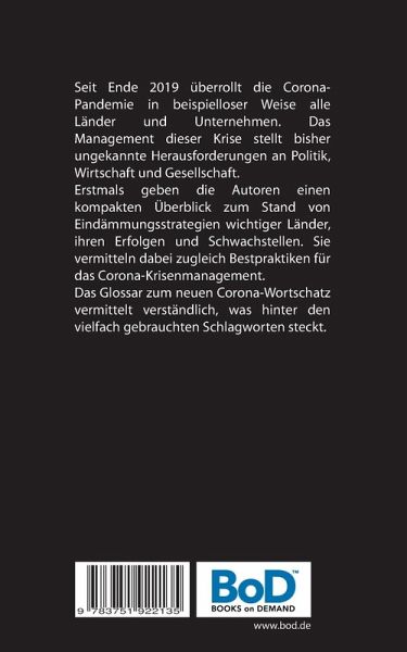 Seit Ende 2019 überrollt die Corona-Pandemie in beispielloser Weise alle Länder und Unternehmen. Das Management dieser Krise stellt bisher ungekannte Herausforderungen an Politik, Wirtschaft und Gesellschaft.Erstmals geben die Autoren einen kompakten Überblick zum Stand von Eindämmungsstrategien wichtiger Länder, ihren Erfolgen und Schwachstellen. Sie vermitteln dabei zugleich Bestpraktiken für das Corona-Krisenmanagement.Das Glossar zum neuen Corona-Wortschatz vermittelt verständlich, was hinter den vielfach gebrauchten Schlagworten steckt.