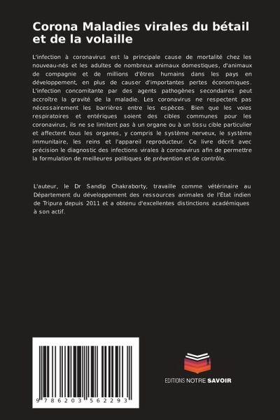 L'infection à coronavirus est la principale cause de mortalité chez les nouveau-nés et les adultes de nombreux animaux domestiques, d'animaux de compagnie et de millions d'êtres humains dans les pays en développement, en plus de causer d'importantes pertes économiques. L'infection concomitante par des agents pathogènes secondaires peut accroître la gravité de la maladie. Les coronavirus ne respectent pas nécessairement les barrières entre les espèces. Bien que les voies respiratoires et entériques soient des cibles communes pour les coronavirus, ils ne se limitent pas à un organe ou à un tissu cible particulier et affectent tous les organes, y compris le système nerveux, le système immunitaire, les reins et l'appareil reproducteur. Ce livre décrit avec précision le diagnostic des infections virales à coronavirus afin de permettre la formulation de meilleures politiques de prévention et de contrôle.