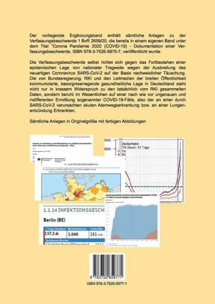 Sämtliche Anlagen in Originalgröße mit farbigen Abbildungen.Der vorliegende Ergänzungsband enthält sämtliche Anlagen zu der Verfassungsbeschwerde 1 BvR 2659/20, die bereits in einem eigenen Band unter dem Titel "Corona Pandemie 2020 (COVID-1 9) - Dokumentation einer Verfassungsbeschwerde, ISBN 978-3-7526-5975-7, veröffentlicht wurde.Die Verfassungsbeschwerde selbst richtet sich gegen das Fortbestehen einer epidemischen Lage von nationaler Tragweite durch SARS-CoV-2 auf der Basis nachweislicher Täuschung. Die von Bundesregierung, RKI und den Leitmedien der breiten Öffentlichkeit kommunizierte, besorgniserregende gesundheitliche Lage in Deutschland steht nicht nur in krassem Widerspruch zu den tatsächlich vom RKI gesammelten Daten, sondern beruht im Wesentlichen auf einer nach wie vor ungenauen und indifferenten Ermittlung sogenannter COVID-1 9-Fälle, also der an einer durch SARS-CoV-2 verursachten akuten Atemwegserkrankung bzw. an einer Lungenentzündung Erkrankten.
