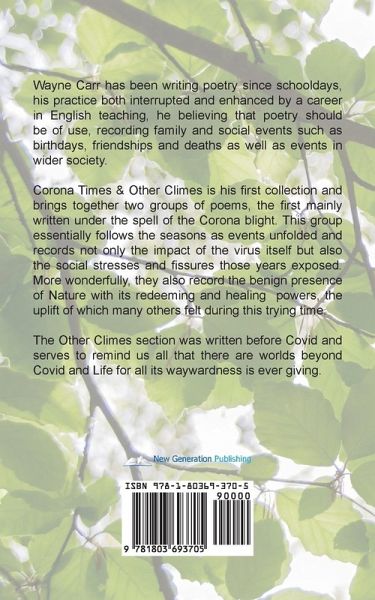 Wayne Carr has been writing poetry since schooldays, his practice both interrupted and enhanced by a career in English teaching, he believing that poetry should be of use, recording family and social events such as birthdays, friendships and deaths as well as events in wider society. Corona Times & Other Climes is his first collection and brings together two groups of poems, the first mainly written under the spell of the Corona blight. This group essentially follows the seasons as events unfolded and records not only the impact of the virus itself but also the social stresses and fissures those years exposed. More wonderfully, they also record the benign presence of Nature with its redeeming and healing powers, the uplift of which many others felt during this trying time. The Other Climes section was written before Covid and serves to remind us all that there are worlds beyond Covid and Life for all its waywardness is ever giving.