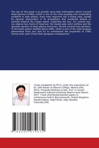 The aim of this book is to provide up-to-date information about Coronal Mass Ejections (CMEs), which is one of the most puzzling and outstanding problems in solar physics. Every main sequence star is losing mass, caused by dynamic phenomena in its atmosphere that accelerate plasma or particles beyond the escape speed. Inspecting the Sun, our nearest star, we observe two forms of mass loss: the steady solar wind outflow and the sporadic ejection of large plasma structures, termed coronal mass ejections. In this book author Studied about CMEs; which is one of the main eruptive phenomena from Sun and try to summarized the properties of CMEs during solar cycle 23 and their geospace consequences.