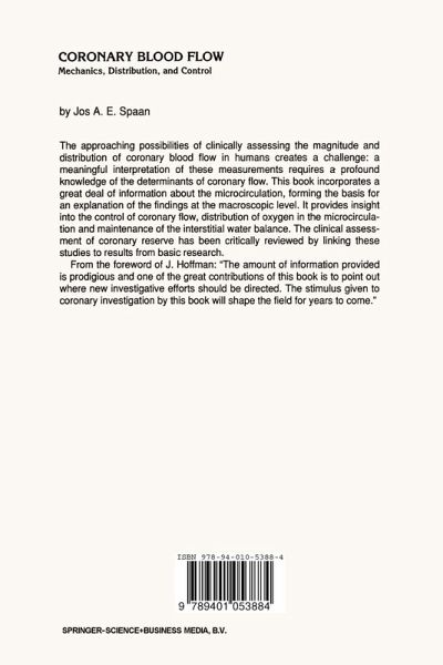 1 Basic coronary physiology.- 1.1 Introduction.- 1.1.1 Heart function and coronary flow.- 1.1.2 Control and extravascular resistance.- 1.1.3 Distribution of supply and demand.- 1.1.4 Mechanics, control and distribution in the coronary circulation.- 1.2 Coronary flow mechanics.- 1.2.1 Inhibition of coronary arterial flow during systole.- 1.2.2 Retrograde coronary arterial flow, venous flow and in-tramyocardial compliance.- 1.3 Regulation of coronary flow.- 1.3.1 Steady local control of coronary flow.- 1.3.2 How to define coronary tone?.- 1.3.3 Rate of adaptation of the coronary circulation to step changes in heart rate.- 1.3.4 Effect of perfusion pressure step.- 1.3.5 Reactive hyperemia.- 1.3.6 Mechanisms of coronary flow control.- 1.4 Heterogeneity in myocardial perfusion and oxygen supply.- 1.4.1 Distribution of flow from endocardium to epicardium.- 1.4.2 Heterogeneity induced by the arterial tree.- 1.4.3 Heterogeneity of oxygen supply/demand ratio.- 1.5 Relation between mechanics, control and distribution of coronary flow.- 1.6 Summary.- References.- 2 Structure and function of the coronary arterial tree.- 2.1 Basic anatomy.- 2.2 Collaterals.- 2.3 Structure of the coronary arterial tree.- 2.3.1 Ratios between diameters of mother and daughter branches.- 2.3.2 Growth of arterial cross-sectional area.- 2.3.3 Length distribution in the arterial tree.- 2.3.4 Arterial density applying symmetrical branching networks..- 2.4 Data on filling volume of the coronary arterial tree.- 2.5 Pressure distribution in the coronary arterial tree.- 2.6 Symmetrical, dichotomous branching network model.- 2.6.1 Definition of model structure.- 2.6.2 Prediction of volume.- 2.6.3 Prediction of pressure.- 2.7 Nonsymmetrical dichotomous branching network analysis.- 2.7.1 Strahler ordering.- 2.7.2Fractal models.- 2.8 Discussion on structure and function of the arterial tree.- 2.9 Summary.- References.- 3 Structure and perfusion of the capillary bed.- 3.1 Structure of capillary bed.- 3.2 Capillary density and volume.- 3.3 Mechanical properties.- 3.4 Red cells in the capillary bed.- 3.4.1 Velocities.- 3.4.2 Red cell distribution at bifurcations.- 3.4.3 Hematocrit.- 3.5 Model of parallel and homogeneous perfused capillary bed.- 3.6 A model for the heterogeneous perfusion of the capillary bed.- 3.7 Capillary recruitment in the heart.- 3.8 Summary.- References.- 4 Structure and function of coronary venous system.- 4.1 Basic anatomy.- 4.2 Distribution of coronary venous flow.- 4.3 Flow and pressure waves in the epicardial veins.- 4.4 Waterfall behavior of coronary epicardial veins.- 4.5 Coronary venous compliance.- 4.6 Summary.- References.- 5 Linear system analysis applied to the coronary circulation.- 5.1 Definitions.- 5.1.1 System.- 5.1.2 Linearity.- 5.1.3 Time and frequency domains.- 5.1.4 Models.- 5.1.5 Load line analysis.- 5.2 Linear intramyocardial pump model.- 5.2.1 Interpretation of the coronary load lines.- 5.2.2 Intramyocardial pump and the right coronary artery.- 5.2.3 Shortcomings of the linear intramyocardial pump model.- 5.3 Load line analysis of collateral flow.- 5.4 Input impedance.- 5.4.1 Input impedance during long diastoles.- 5.4.2 Coronary impulse response in diastole and systole.- 5.4.3 Model interpretation of coronary input impedance.- 5.5 Nonlinear physical elements and linear system analysis.- 5.6 Discussions of the linear models of coronary circulation.- 5.7 Summary.- References.- 6 Interaction between contraction and coronary flow: Theory.- 6.1 Systolic extravascular resistance model.- 6.1.1 Basic behavior of extravascular resistance model.-6.1.2 Discussion of extravascular resistance model.- 6.2 The waterfall model.- 6.2.1 Basic model behavior of the waterfall model.- 6.3 Nonlinear intramyocardial pump model.- 6.3.1 Pressure dependency of compartmental resistance.- 6.3.2 Steady state arterial pressure-flow relations during arrest.- 6.3.3 Solutions for the subendocardial model layer of the contracting myocardium.- 6.3.4 Compartmental volume variations.- 6.3.5 Flow simulations.- 6.4 Variable elastance model.- 6.4.1 Experimental support.- 6.4.2 Variable elastance concept.- 6.4.3 A mathematical intramyocardial pump model with time varying elastance as pump generator.- 6.5 Discussion.- 6.6 Summary.- References.- 7 Interaction between contraction and coronary flow: Experiment.- 7.1 Parallel shift of pressure-flow relations.- 7.2 Pressure dependency of coronary resistance.- 7.3 Effect of heart rate on microsphere distribution.- 7.4 Contractility and microsphere distribution.- 7.5 Intramyocardial compliance.- 7.6 Pulsations in coronary pressure at constant flow perfusion.- 7.7 Diastolic pressure-flow lines.- 7.8 Discussion.- 7.9 Summary.- References.- 8 Arteriolar mechanics and control of flow.- 8.1 Morphology of the arteriolar wall.- 8.2 Myogenic response.- 8.3 Arteriolar vasomotion.- 8.4 Strain and stress in the arteriolar wall.- 8.5 Myogenic responses in relation to autoregulation of flow.- 8.5.1 Relation between pressure and resistance with and without myogenic tone.- 8.5.2 Width of the autoregulatory plateau.- 8.5.3 The optimal strength of myogenic tone.- 8.6 Compliance of arterioles.- 8.6.1 Effect of tone on static compliance.- 8.6.2 Quasi-static distensibility of dilated coronary arteries.- 8.6.3 Frequency dependency of distensibility of active and passive small coronary arteries.- 8.7 Discussion.- 8.7.1Vasodilation.- 8.7.2 Arterioles and regulation of flow.- 8.8 Summary.- References.- 9 Static and dynamic analysis of local control of coronary flow.- 9.1 Introduction.- 9.2 Steady state behavior of flow control.- 9.3 Characteristics of dynamic coronary flow control.- 9.3.1 Rate of change in flow adaptation.- 9.3.2 Rate of change of autoregulation.- 9.3.3 Summary of t50 values.- 9.4 Rate of change in myocardial oxygen Consumption.- 9.4.1 Model for the correction of changing oxygen buffers.- 9.4.2 Transients in oxygen consumption.- 9.5 Oxygen model of coronary flow control.- 9.5.1 Model definition 