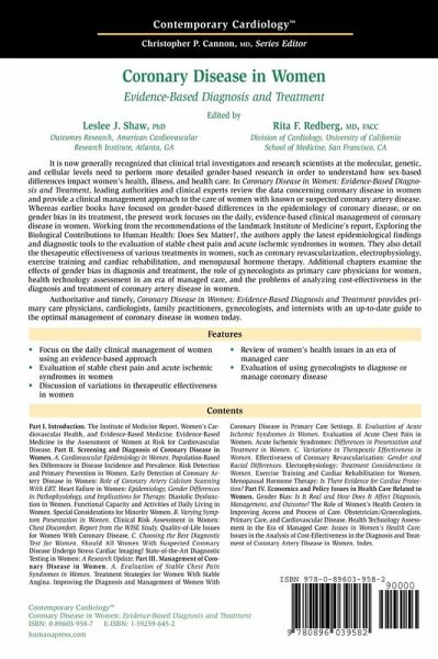 Authoritative and timely, Coronary Disease in Women: Evidence-Based Diagnosis and Treatment provides primary care physicians, cardiologists, family practitioners, gynecologists, and internists with an up-to-date guide to the optimal management of coronary disease in women today.