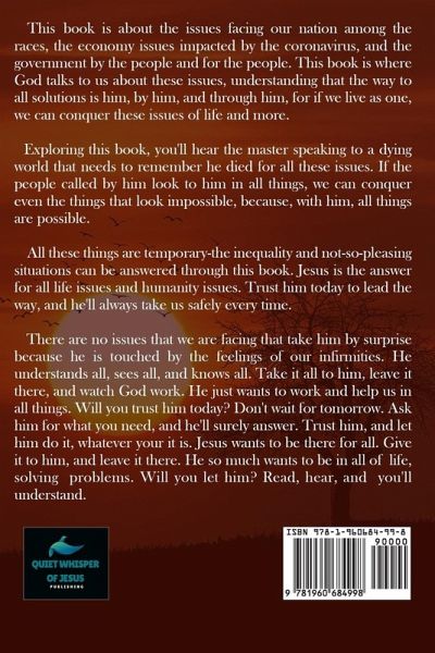 This book is about the issues facing our nation among the races, the economic issues impacted by the coronavirus, and the government by the people and for the people. This book is where God talks to us about these issues, understanding that the way to all solutions is Him, by Him, and through Him, for if we live as one, we can conquer these issues of life and more. Exploring this book, you'll hear the master speaking to a dying world that needs to remember he died for all these issues. If the people called by Him look to Him in all things, we can conquer even the things that look impossible, because, with Him, all things are possible. All these things are temporary-the inequality and not-so-pleasing situations can be answered through this book. Jesus is the answer for all life issues and humanity issues. Trust Him today to lead the way, and He'll always take us safely every time. There are no issues that we are facing that take him by surprise¿¿ because he is touched by the feelings of our infirmities. He understands all, sees all, and knows all. Take it all to Him, leave it there, and watch God work. He just wants to work and help us in all things. Will you trust him today? Don't wait for tomorrow. Ask him for what you need, and he'll surely answer. Trust him, and let him do it, whatever it is. Jesus wants to be there for all. Give it to him, and leave it there. He so much wants to be in all of life, solving problems. Will you let him? Read, hear, and¿ you'll understand.