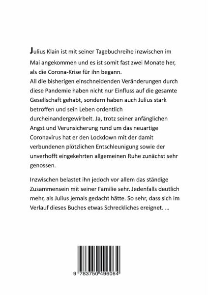 Julius Klain ist mit seiner Tagebuchreihe inzwischen im Mai angekommen und es ist somit fast zwei Monate her, als die Corona-Krise für ihn begann. All die bisherigen einschneidenden Veränderungen durch diese Pandemie haben nicht nur Einfluss auf die gesamte Gesellschaft gehabt, sondern haben auch Julius stark betroffen und sein Leben ordentlich durcheinandergewirbelt. Ja, trotz seiner anfänglichen Angst und Verunsicherung rund um das neuartige Coronavirus hat er den Lockdown mit der damit verbundenen plötzlichen Entschleunigung sowie der unverhofft eingekehrten allgemeinen Ruhe zunächst sehr genossen.Inzwischen belastet ihn jedoch vor allem das ständige Zusammensein mit seiner Familie sehr. Jedenfalls deutlich mehr, als Julius jemals gedacht hätte. So sehr, dass sich im Verlauf dieses Buches etwas Schreckliches ereignet. ...
