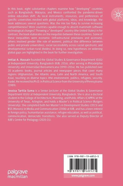 In this book, eight substantive chapters examine how "developing" countries such as Bangladesh, Malaysia, and Mexico confronted the pandemic-driven online education shift. As local instruments, resources, and preferences of specific universities meshed with global platforms, ideas, and knowledge, the book addresses several questions. Was the mix too flaky to survive increasing competitiveness? Were countries capable enough to absorb mammoth software technological changes? Throwing a "developed" country (the United States) in for contrast, the book elaborates on the inequities between these countries. Some of these inequalities were economic (infrastructural provisions and accesses), others involved gender (the role of women), political (the difference between public and private universities), social (accessibility across social spectrum), and developmental (urban-rural divides). In doing so, new hypotheses on widening global gaps are highlighted in the book for further investigation.