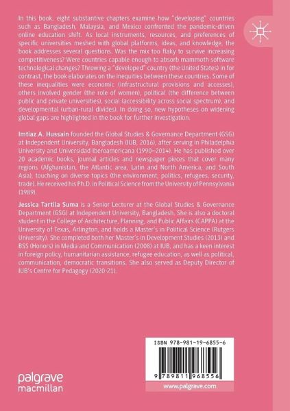 In this book, eight substantive chapters examine how "developing" countries such as Bangladesh, Malaysia, and Mexico confronted the pandemic-driven online education shift. As local instruments, resources, and preferences of specific universities meshed with global platforms, ideas, and knowledge, the book addresses several questions. Was the mix too flaky to survive increasing competitiveness? Were countries capable enough to absorb mammoth software technological changes? Throwing a "developed" country (the United States) in for contrast, the book elaborates on the inequities between these countries. Some of these inequalities were economic (infrastructural provisions and accesses), others involved gender (the role of women), political (the difference between public and private universities), social (accessibility across social spectrum), and developmental (urban-rural divides). In doing so, new hypotheses on widening global gaps are highlighted in the book for further investigation.