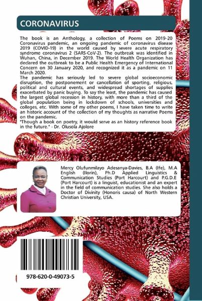 The book is an Anthology, a collection of Poems on 2019-20 Coronavirus pandemic, an ongoing pandemic of coronavirus disease 2019 (COVID-19) in the world caused by severe acute respiratory syndrome coronavirus 2 (SARS-CoV-2). The outbreak was identified in Wuhan, China, in December 2019. The World Health Organization has declared the outbreak to be a Public Health Emergency of International Concern on 30 January 2020, and recognized it as a pandemic on 11 March 2020.The pandemic has seriously led to severe global socioeconomic disruption, the postponement or cancellation of sporting, religious, political and cultural events, and widespread shortages of supplies exacerbated by panic buying. To say the least, the pandemic has caused the largest global recession in history, with more than a third of the global population being in lockdown of schools, universities and colleges, etc. With some of my other poems, I have taken time to write an historic account of the collection of my thoughts as narrative Poems on the pandemic."Though a book on poetry, it would serve as an history reference book in the future." - Dr. Olusola Ajolore