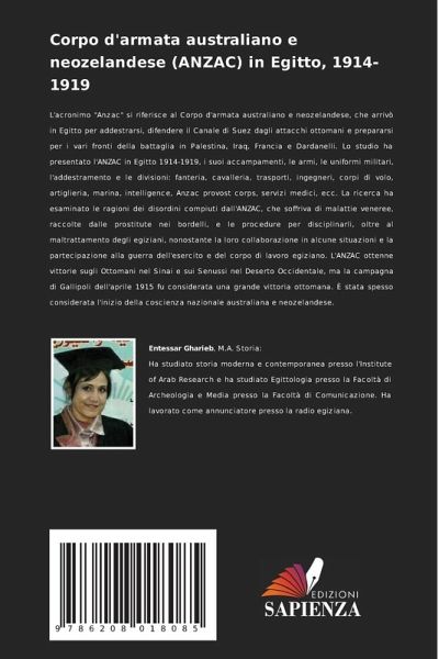 L'acronimo "Anzac" si riferisce al Corpo d'armata australiano e neozelandese, che arrivò in Egitto per addestrarsi, difendere il Canale di Suez dagli attacchi ottomani e prepararsi per i vari fronti della battaglia in Palestina, Iraq, Francia e Dardanelli. Lo studio ha presentato l'ANZAC in Egitto 1914-1919, i suoi accampamenti, le armi, le uniformi militari, l'addestramento e le divisioni: fanteria, cavalleria, trasporti, ingegneri, corpi di volo, artiglieria, marina, intelligence, Anzac provost corps, servizi medici, ecc. La ricerca ha esaminato le ragioni dei disordini compiuti dall'ANZAC, che soffriva di malattie veneree, raccolte dalle prostitute nei bordelli, e le procedure per disciplinarli, oltre al maltrattamento degli egiziani, nonostante la loro collaborazione in alcune situazioni e la partecipazione alla guerra dell'esercito e del corpo di lavoro egiziano. L'ANZAC ottenne vittorie sugli Ottomani nel Sinai e sui Senussi nel Deserto Occidentale, ma la campagna di Gallipoli dell'aprile 1915 fu considerata una grande vittoria ottomana. È stata spesso considerata l'inizio della coscienza nazionale australiana e neozelandese.