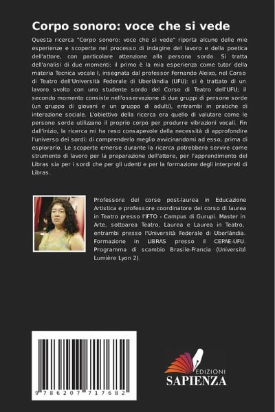 Questa ricerca "Corpo sonoro: voce che si vede" riporta alcune delle mie esperienze e scoperte nel processo di indagine del lavoro e della poetica dell'attore, con particolare attenzione alla persona sorda. Si tratta dell'analisi di due momenti: il primo è la mia esperienza come tutor della materia Tecnica vocale I, insegnata dal professor Fernando Aleixo, nel Corso di Teatro dell'Università Federale di Uberlândia (UFU): si è trattato di un lavoro svolto con uno studente sordo del Corso di Teatro dell'UFU; il secondo momento consiste nell'osservazione di due gruppi di persone sorde (un gruppo di giovani e un gruppo di adulti), entrambi in pratiche di interazione sociale. L'obiettivo della ricerca era quello di valutare come le persone sorde utilizzano il proprio corpo per produrre vibrazioni vocali. Fin dall'inizio, la ricerca mi ha reso consapevole della necessità di approfondire l'universo dei sordi: di comprenderlo meglio avvicinandomi ad esso, prima di esplorarlo. Le scoperte emerse durante la ricerca potrebbero servire come strumento di lavoro per la preparazione dell'attore, per l'apprendimento del Libras sia per i sordi che per gli udenti e per la formazione degli interpreti di Libras.
