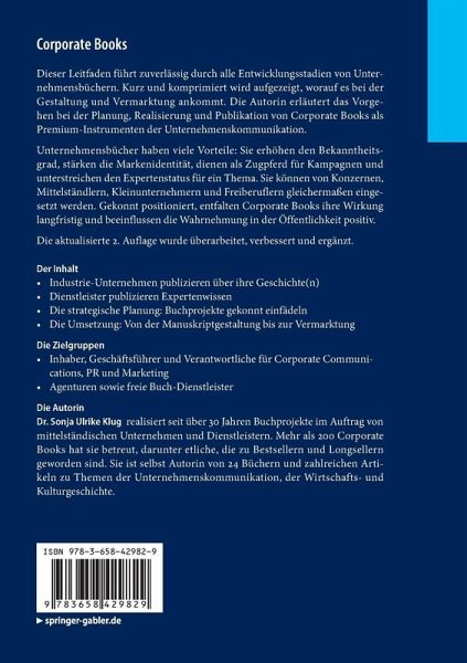 Dieser Leitfaden führt zuverlässig durch alle Entwicklungsstadien von Unternehmensbüchern. Kurz und komprimiert wird aufgezeigt, worauf es bei der Gestaltung und Vermarktung ankommt. Die Autorin erläutert das Vorgehen bei der Planung, Realisierung und Publikation von Corporate Books als Premium-Instrumenten der Unternehmenskommunikation.Unternehmensbücher haben viele Vorteile: Sie erhöhen den Bekanntheitsgrad, stärken die Markenidentität, dienen als Zugpferd für Kampagnen und unterstreichen den Expertenstatus für ein Thema. Sie können von Konzernen, Mittelständlern, Kleinunternehmern und Freiberuflern gleichermaßen eingesetzt werden. Gekonnt positioniert, entfalten Corporate Books ihre Wirkung langfristig und beeinflussen die Wahrnehmung in der Öffentlichkeit positiv.Die aktualisierte 2. Auflage wurde überarbeitet, verbessert und ergänzt.