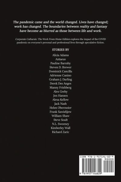 The pandemic came and the world changed. Lives have changed; work has changed. The boundaries between reality and fantasy have become as blurred as those between life and work. Corporate Catharsis: The Work From Home Edition explores the impact of the COVID pandemic on everyone's personal and professional lives through speculative fiction. With stories by Alicia Adams, Antaeus, Pauline Barmby, Steven D. Brewer, Dominick Cancilla, Adrienne Canino, Graham J. Darling, Derek Des Anges, Manny Frishberg, Alex Grehy, Jon Hansen, Alexa Kellow, Jack Nash, Helen Obermeier, Frank Sawielijew, William Shaw, Steve Soult, N.L. Sweeney, Kimberley Wall, and Richard Zaric.