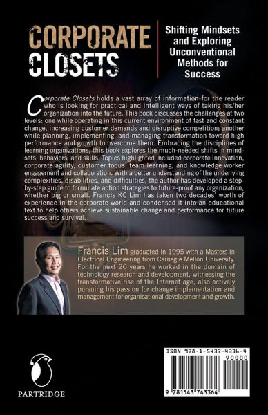 Corporate Closets holds a vast array of information for the reader who is looking for practical and intelligent ways of taking his/her organization into the future. This book discusses the challenges at two levels: one while operating in this current environment of fast and constant change, increasing customer demands and disruptive competition; another while planning, implementing, and managing transformation toward high performance and growth to overcome them. Embracing the disciplines of learning organizations, this book explores the much-needed shifts in mind-sets, behaviors, and skills. Topics highlighted included corporate innovation, corporate agility, customer focus, team learning, and knowledge worker engagement and collaboration. With a better understanding of the underlying complexities, disabilities, and difficulties, the author has developed a step-by-step guide to formulate action strategies to future-proof any organization, whether big or small. Francis KC Lim has taken two decades' worth of experience in the corporate world and condensed it into an educational text to help others achieve sustainable change and performance for future success and survival.
