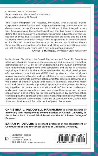 In this book, Christina L. McDowell Marinchak and Sarah M. DeIuliis explore ways to unite corporate communication and integrated marketing communication (IMC ) by better understanding the human communication relationships people have with companies and brands in a technological age. Specifically, the authors analyze the historical development of corporate communication and IMC, the importance of rhetorically engaging audiences ethically, and the relationship between organizational culture and corporate communication and IMC practices. Drawing on a wide array of popular culture and industry examples, McDowell Marinchak and DeIuliis provide a practical approach and argument for bringing together corporate communication and IMC to better understand audience in business practices. In an age where the connection between consumption and identity are further compounded by communication technologies, this approach offers an ethical and pragmatic way to reach audiences beyond stakeholders. Scholars of communication, public relations, and business will find this book of particular interest.