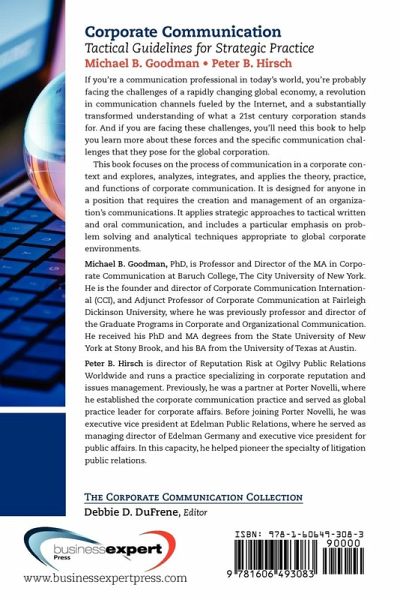 «In today's global environment, there is no function within a major corporation more important than what is commonly called corporate communication. This new book, 'Corporate Communication: Strategic Adaptation for Global Practice', written by Goodman and Hirsch, supports that conclusion with comprehensive and convincing evidence. Large companies cannot succeed today without successfully managing relationships with their key constituencies in the context of what is desired by those constituencies. Previously, only the CEO him or herself has been in a position to view all of those audiences with a balanced view of what is ethical and correct behavior. The fully developed corporate communication function of today has evolved to work side by side with the CEO and Boards of Directors. The function not only influences what and how a company speaks, but also how it acts. The Goodman/Hirsch book makes that case more strongly than any text written in the past. It should be must reading for not only the professional communicator but for all CEOs and Boards of Directors to see the unique and priceless value the corporate communication function can bring to the corporate table today.» (James E. Murphy, Retired Chief Marketing and Communications Officer of Accenture; Chairman & CEO of Murphy & Co.)