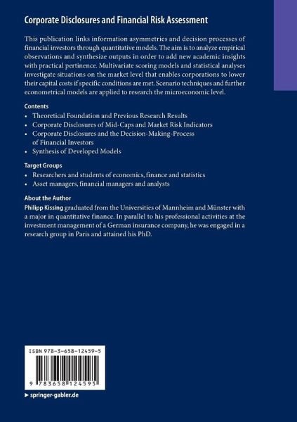 This publication links information asymmetries anddecision processes of financial investors through quantitative models. The aimis to analyze empirical observations and synthesize outputs in order to add newacademic insights with practical pertinence. Multivariate scoring models and statistical analysesinvestigate situations on the market level that enables corporations to lowertheir capital costs if specific conditions are met. Scenario techniques andfurther econometrical models are applied to research the microeconomic level.