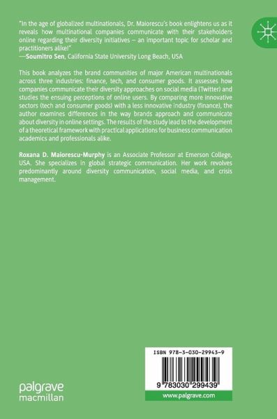 This book analyzes the brand communities of major American multinationals across three industries: finance, tech, and consumer goods. It assesses how companies communicate their diversity approaches on social media (Twitter) and studies the ensuing perceptions of online users. By comparing more innovative sectors (tech and consumer goods) with a less innovative industry (finance), the author examines differences in the way brands approach and communicate about diversity in online settings. The results of the study lead to the development of a theoretical framework with practical applications for business communication academics and professionals alike.