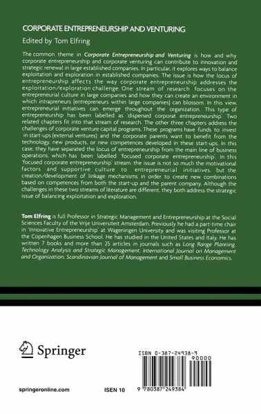 Corporate Entrepreneurship and Venturing is positioned at the crossroads of the strategy and entrepreneurship fields. The common theme is how and why corporate entrepreneurship and corporate venturing can contribute to innovation and strategic renewal in large established companies, in particular it explores ways to balance exploitation and exploration in established companies. The issue is how the locus of entrepreneurship affects the way corporate entrepreneurship addresses the exploitation/exploration challenge. In some chapters corporate entrepreneurship is dispersed across the organization and they examine the key elements of an entrepreneurial culture and the organizational conditions that are favorable to entrepreneurial initiatives. The other chapters contribute to the discussion on the potential role of corporate venturing which is separated from the main parts of the organization. They examine the advantages and disadvantages of corporate venture capital programs asparticular forms of focused corporate entrepreneurship.