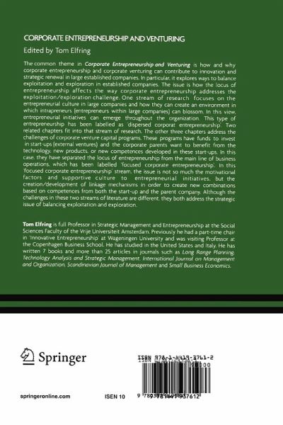 Corporate Entrepreneurship and Venturing is positioned at the crossroads of the strategy and entrepreneurship fields. The common theme is how and why corporate entrepreneurship and corporate venturing can contribute to innovation and strategic renewal in large established companies, in particular it explores ways to balance exploitation and exploration in established companies. The issue is how the locus of entrepreneurship affects the way corporate entrepreneurship addresses the exploitation/exploration challenge. In some chapters corporate entrepreneurship is dispersed across the organization and they examine the key elements of an entrepreneurial culture and the organizational conditions that are favorable to entrepreneurial initiatives. The other chapters contribute to the discussion on the potential role of corporate venturing which is separated from the main parts of the organization. They examine the advantages and disadvantages of corporate venture capital programs asparticular forms of focused corporate entrepreneurship.