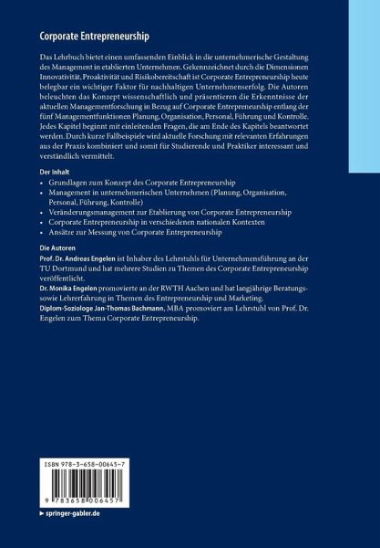 Das Lehrbuch bietet einen umfassenden Einblick in die unternehmerische Gestaltung des Management in etablierten Unternehmen. Gekennzeichnet durch die Dimensionen Innovativität, Proaktivität und Risikobereitschaft ist Corporate Entrepreneurship heute belegbar ein wichtiger Faktor für nachhaltigen Unternehmenserfolg. Die Autoren beleuchten das Konzept wissenschaftlich und präsentieren die Erkenntnisse der aktuellen Managementforschung in Bezug auf Corporate Entrepreneurship entlang der fünf Managementfunktionen Planung, Organisation, Personal, Führung und Kontrolle. Jedes Kapitel beginnt mit einleitenden Fragen, die am Ende des Kapitels beantwortet werden. Durch kurze Fallbeispiele wird aktuelle Forschung mit relevanten Erfahrungen aus der Praxis kombiniert und somit für Studierende und Praktiker interessant und verständlich vermittelt.