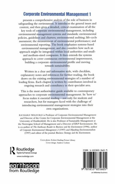 Presents a comprehensive analysis of the role of business in safeguarding the environment. It introduces the general issues and context, and then gives a detailed, critical examination of all the key tools of corporate environmental management, including environmental management systems and standards; environmental policies, guidelines and charters; environmental auditing; life-cycle assessment; the measurement of environmental performance; and environmental reporting. The book emphasises systems-based environmental management, and also considers how such an approach might be integrated within local authorities and small and medium-sized companies. It then extends the systems approach to cover continuous environmental improvement, building a corporate environmental profile and moving towards sustainability. Written in a clear and informative style, with checklists, explanatory notes and references for further reading, the book draws on the existing environmental strategies of a number of leading firms. Each chapter is written by contributors involved in ongoing research and consultancy in their specialist area. This is the most authoritative guide available to contemporary approaches to corporate environmental management. Its 'how to' focus makes it essential reading - not only for students and researchers, but for managers faced with the challenge of introducing environmental management strategies into their own organizations. RICHARD WELFORD is Professor of Corporate Environmental Management and Director of the Centre for Corporate Environmental Management at the University of Huddersfield. He is also Professor of Sustainable Management at the Norwegian School of Management and a Director of ERP Environment. He is co-author of The Eartl15can Reader in Business and the Environment (1996), author of Corporate Environmentalll.1anagement 2 (1997) and Hijacking Environmentalism (1997) and editor of the journal Business Strategy and the Environment. Originally published in 1998