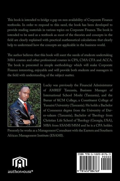This book is intended to bridge a gap on non availability of Corporate Finance textbooks. In order to respond to this need, the book has been developed to provide reading materials in various topics on Corporate Finance. The book is intended to be used as a textbook as most of the theories and concepts in the field are clearly explained with practical mathematical calculations that clearly help to understand how the concepts are applicable in the business world. The author believes that this book will meet the needs of students undertaking MBA courses and other professional courses in CPA, CMA CFA and ACCA. The book is presented in simple methodology which will make Corporate Finance interesting, enjoyable and will provide both students and managers in the field with understanding of the subject matter.