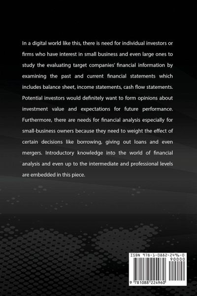 In a digital world like this, there is need for individual investors or firms who have interest in small business and even large ones to study the evaluating target companies' financial information by examining the past and current financial statements which includes balance sheet, income statements, cash flow statements. Potential investors would definitely want to form opinions about investment value and expectations for future performance. Furthermore, there are needs for financial analysis especially for small-business owners because they need to weight the effect of certain decisions like borrowing, giving out loans and even mergers. Introductory knowledge into the world of financial analysis and even up to the intermediate and professional levels are embedded in this piece.