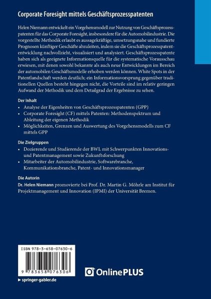 Helen Niemann entwickelt ein Vorgehensmodell zur Nutzung von Geschäftsprozesspatenten für das Corporate Foresight, insbesondere für die Automobilindustrie. Die vorgestellte Methodik erlaubt es aussagekräftige, umsetzungsnahe und fundierte Prognosen künftiger Geschäfte abzuleiten, indem sie die Geschäftsprozesspatententwicklung nachvollzieht, visualisiert und analysiert. Geschäftsprozesspatente haben sich als geeignete Informationsquelle für die systematische Vorausschau erwiesen, mit denen sowohl bekannte als auch neue Entwicklungen im Bereich der automobilen Geschäftsmodelle erhoben werden können. White Spots in der Patentlandschaft werden deutlich; ein Informationsvorsprung gegenüber traditionellen Quellen besteht hingegen nicht, die Vorteile sind im relativ geringen Aufwand der Methodik und dem Detailgrad der Ergebnisse zu sehen.