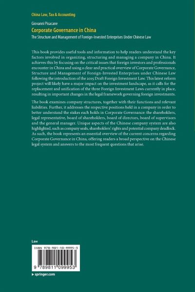 This book provides useful tools and information to help readers understand the key factors involved in organizing, structuring and managing a company in China. It achieves this by focusing on the critical issues that foreign investors and professionals encounter in China and using a clear and practical overview of Corporate Governance, Structure and Management of Foreign-Invested Enterprises under Chinese Law following the introduction of the 2015 Draft Foreign Investment Law. This latest reform project will likely have a major impact on the investment landscape, as it calls for the replacement and unification of the three Foreign Investment Laws currently in place, resulting in important changes in the legal framework governing foreign investments.The book examines company structures, together with their functions and relevant liabilities. Further, it addresses the respective positions held in a company in order to better understand the stakes each holds in Corporate Governance:the shareholders, legal representative, board of shareholders, board of directors, board of supervisors and the general manager. Unique aspects of the Chinese company system are also highlighted, such as company seals, shareholders' rights and potential company deadlock. As such, the book represents an essential overview of the current concerns regarding Corporate Governance in China, offering readers a broad perspective on the Chinese legal system and answers to the most frequent questions that arise.