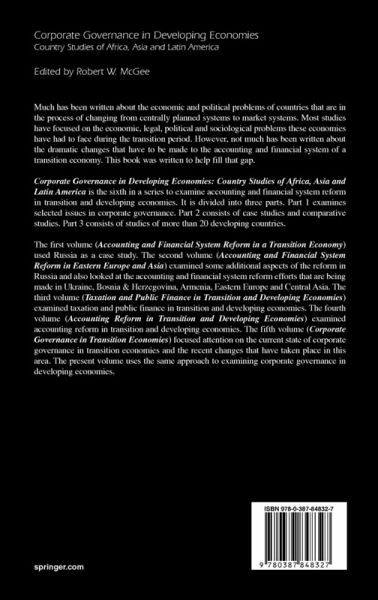 Selected Issues in Corporate Governance.- Corporate Governance in Developing Economies.- Shareholder Rights Issues.- Equitable Treatment of Shareholders.- The Role of Stakeholders in Corporate Governance.- Disclosure&Transparency.- The Responsibility of the Board.- Insider Trading in Developing Economies.- The Market for Corporate Control in Developing Economies.- Case Studies and Comparative Studies.- The Timeliness of Financial Reporting in Developing Countries: An Overview.- Corporate Governance and the Timeliness of Financial Reporting: A Case Study of Kenya.- Corporate Governance and the Timeliness of Financial Reporting: A Case Study of Kenya and the European Union.- Corporate Governance and the Timeliness of Financial Reporting: A Comparative Study of Kenya and the United States of America.- Corporate Governance and the Timeliness of Financial Reporting: A Comparative Study of Kenya and Russia.- Corporate Governance and the Timeliness of Financial Reporting: A Comparative Study of Kenya and the People's Republic of China.- Corporate Governance in Asia: A Comparative Study.- Corporate Governance in Latin America: A Comparative Study.- A Comparative Analysis of Corporate Governance Systems in Latin America: Argentina, Brazil, Chile, Colombia, and Venezuela.- Corporate Governance in Africa and the Middle East: A Comparative Study.- International Influence on Accountancy in Vietnam.- Country Studies.- An Overview of Corporate Governance Practices in Bhutan.- An Overview of Corporate Governance Practices in India.- An Overview of Corporate Governance Practices in Indonesia.- An Overview of Corporate Governance Practices in the Republic of Korea.- An Overview of Corporate Governance Practices in Malaysia.- An Overview of Corporate Governance Practices in Nepal.- AnOverview of Corporate Governance Practices in Pakistan.- An Overview of Corporate Governance Practices in the Philippines.- An Overview of Corporate Governance Practices in Thailand.- An Overview of Corporate Governance Practices in Turkey.- An Overview of Corporate Governance Practices in Vietnam.- An Overview of Corporate Governance Practices in Brazil.- An Overview of Corporate Governance Practices in Chile.- An Overview of Corporate Governance Practices in Colombia.- An Overview of Corporate Governance Practices in Mexico.- An Overview of Corporate Governance Practices in Panama.- An Overview of Corporate Governance Practices in Peru.- An Overview of Corporate Governance Practices in Uruguay.- An Overview of Corporate Governance Practices in Egypt.- An Overview of Corporate Governance Practices in Ghana.- An Overview of Corporate Governance Practices in Jordan.- An Overview of Corporate Governance Practices in Mauritius.- An Overview of Corporate Governance Practices in Senegal.- An Overview of Corporate Governance Practices in South Africa.- An Overview of Corporate Governance Practices in Zimbabwe.